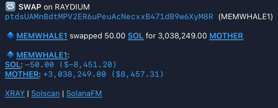 ✜ Otrzymałem powiadomienie ze śledzonego portfela o zakupie tokena $MOTHER.