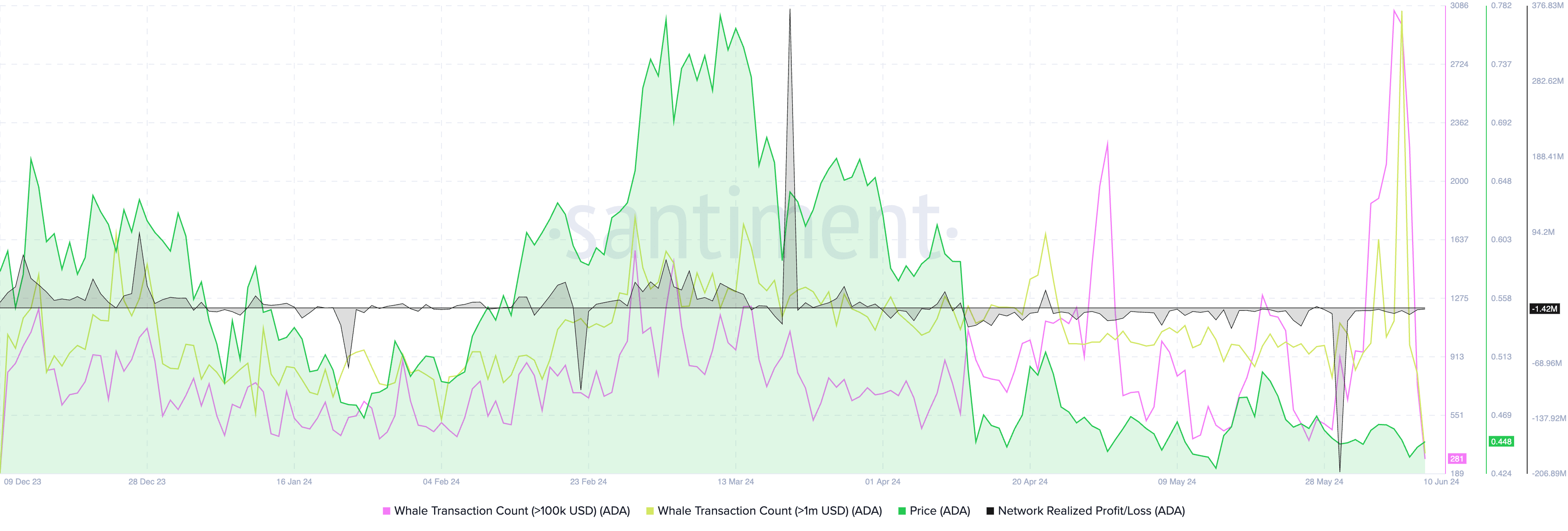 W połączeniu ze wskaźnikiem zrealizowanego zysku/straty sieci (NRPL) pokazuje to, że wieloryby prawdopodobnie poniosły straty w swoich gospodarstwach. Metryka określa zysk/stratę netto wszystkich tokenów ADA przeniesionych w danym dniu. Posiadacze ADA ponieśli straty w wysokości prawie 40 milionów dolarów między 1 a 10 czerwca, co może oznaczać kapitulację wśród traderów.