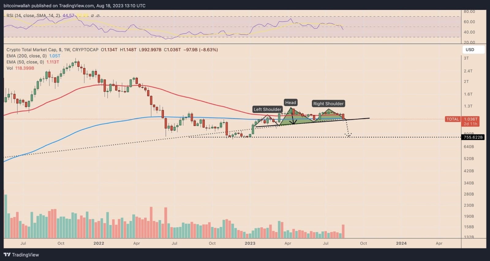 Os indicadores técnicos do mercado de criptomoedas também refletem os desafios atuais. Um potencial padrão de cabeça e ombros está se formando no gráfico semanal. Este padrão é um indicador de um padrão de reversão de baixa, que geralmente é confirmado depois que o preço se move abaixo da linha de suporte ou linha de pescoço. O mercado de criptomoedas testou o decote do padrão cabeça e ombros em 18 de agosto, sugerindo um possível movimento descendente.