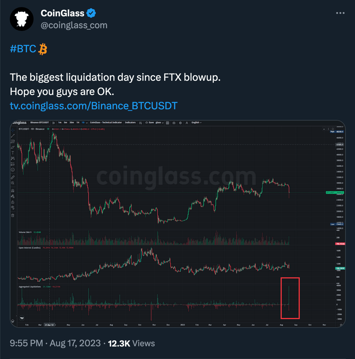 Num contexto de queda acentuada em #биткоина , os traders começaram a agir. No dia 18 de agosto, mais de 176 mil traders liquidaram contratos no valor de US$ 1,04 bilhão. Sabe-se que a maioria dos traders negociou em posições longas, por isso tiveram que vender com prejuízo para economizar fundos. Isso influenciou a queda adicional do Bitcoin. O movimento “pioneiro” foi repetido por todas as outras moedas do mercado.
