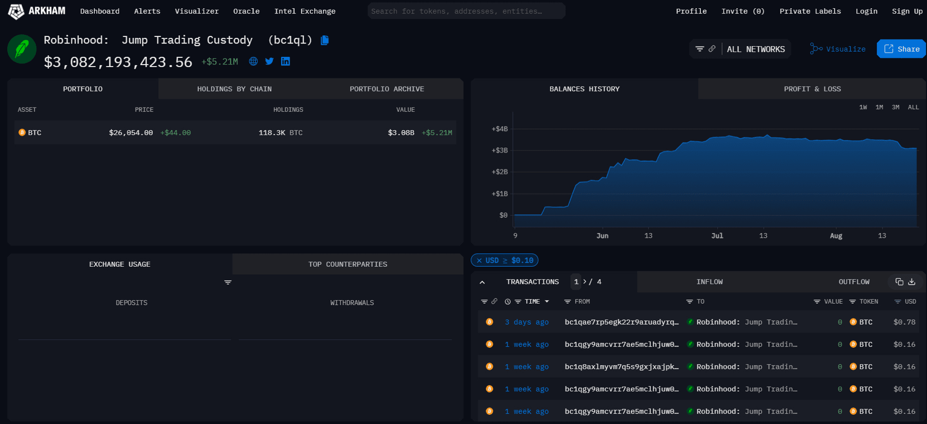 Embora alguns afirmem que o endereço pertence à exchange de criptomoedas Gemini, dados fornecidos pela Arkham sugerem que a carteira pertence à Robinhood.