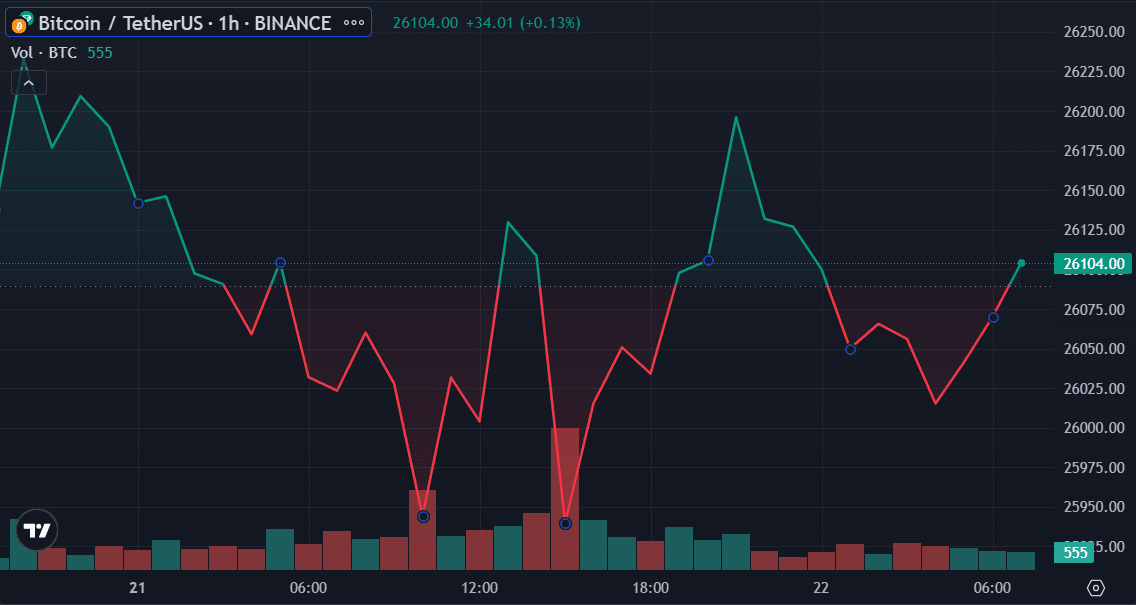 O Bitcoin subiu 0,24% nas últimas 24 horas e está sendo negociado a US$ 26.070 no momento da escrita. O aumento ocorre enquanto o volume de negociação de 24 horas do ativo testemunhou um aumento de 40%, atingindo US$ 12,9 bilhões.