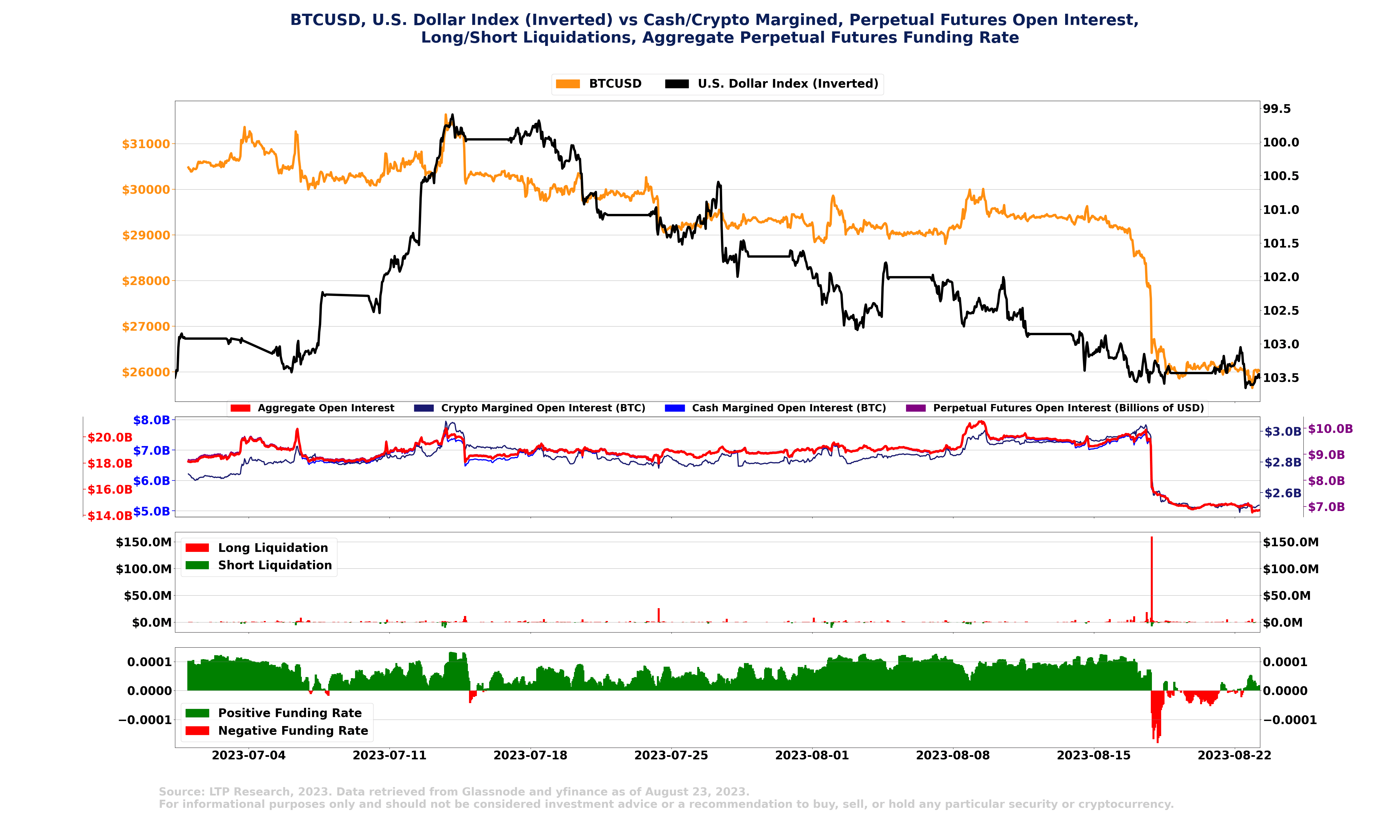 Ao longo de julho e meados de agosto, o preço do Bitcoin foi negociado dentro de um padrão de consolidação limitado por uma faixa, coincidindo com o fortalecimento do Índice do Dólar. No entanto, em 16 de agosto, a divulgação das Atas da Reunião do FOMC de julho desencadeou uma liquidação no mercado de criptomoedas, pois o Fed indicou que manteria uma política monetária restritiva até que houvesse sinais claros de contenção da inflação. Isso resultou na liquidação de mais de US$ 150 milhões em posições longas e um declínio no interesse aberto de aproximadamente US$ 5 bilhões no total. O evento de desalavancagem também fez com que as taxas de financiamento se tornassem negativas. Notavelmente, a liquidação foi pausada em US$ 26.000, as taxas de financiamento retornaram ao território neutro, enquanto o interesse aberto agregado permaneceu relativamente inalterado, sugerindo incerteza contínua no mercado.
