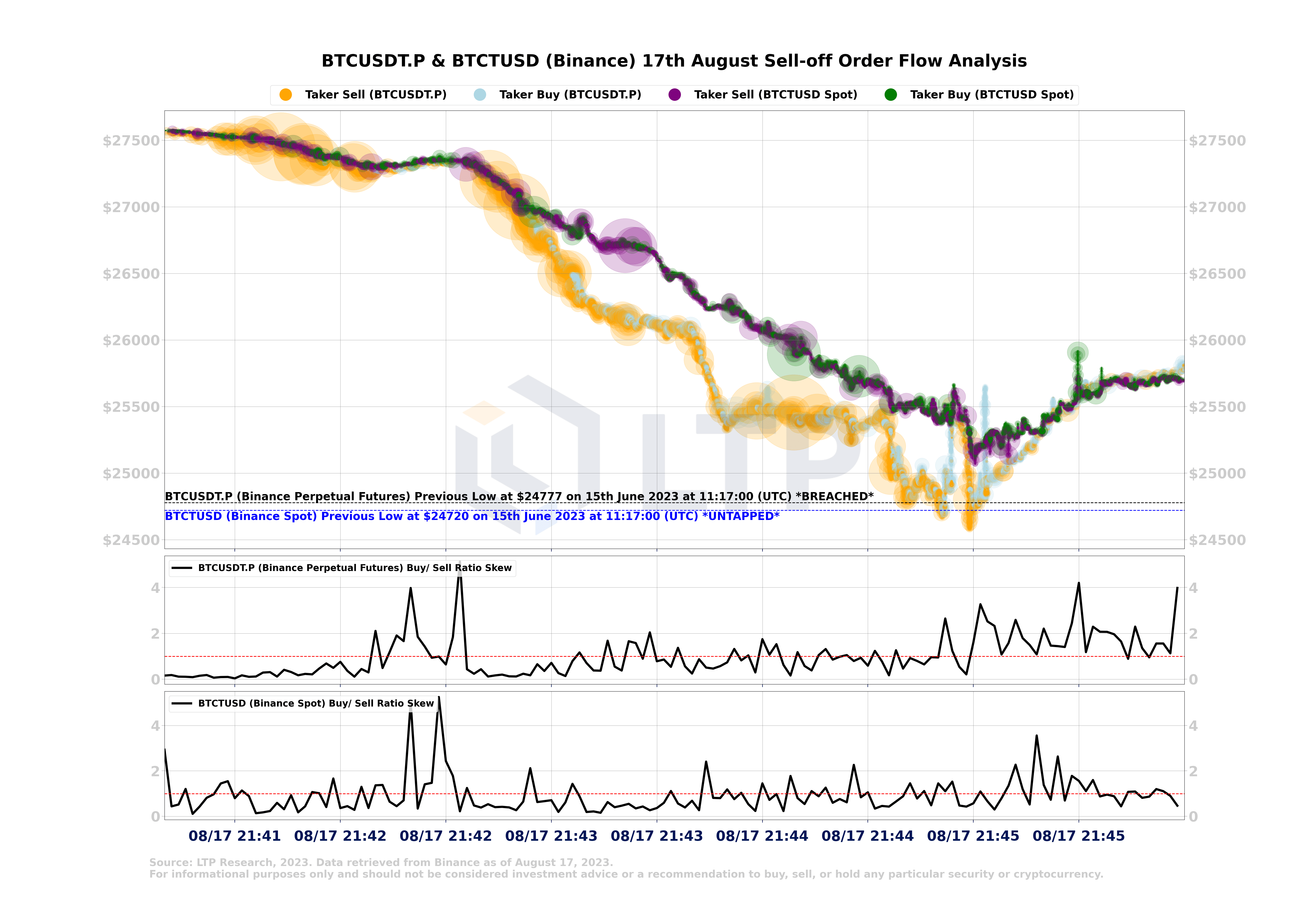 Uma série de eventos de liquidação ocorreu em um período de 5 minutos em 17 de agosto, entre 21:41 e 21:45 (UTC). A visualização fornecida indica que o mercado de Futuros Perpétuos na Binance exibiu uma distorção significativa do lado da venda, fazendo com que o preço se desviasse daquele do mercado à vista BTCTUSD durante o período de liquidação. Além disso, é evidente que compradores especulativos entraram no mercado às 21:45, já que o preço dos Futuros Perpétuos do Bitcoin caiu logo abaixo de sua mínima anterior (US$ 24.777) em 15 de junho às 11:17 (UTC).