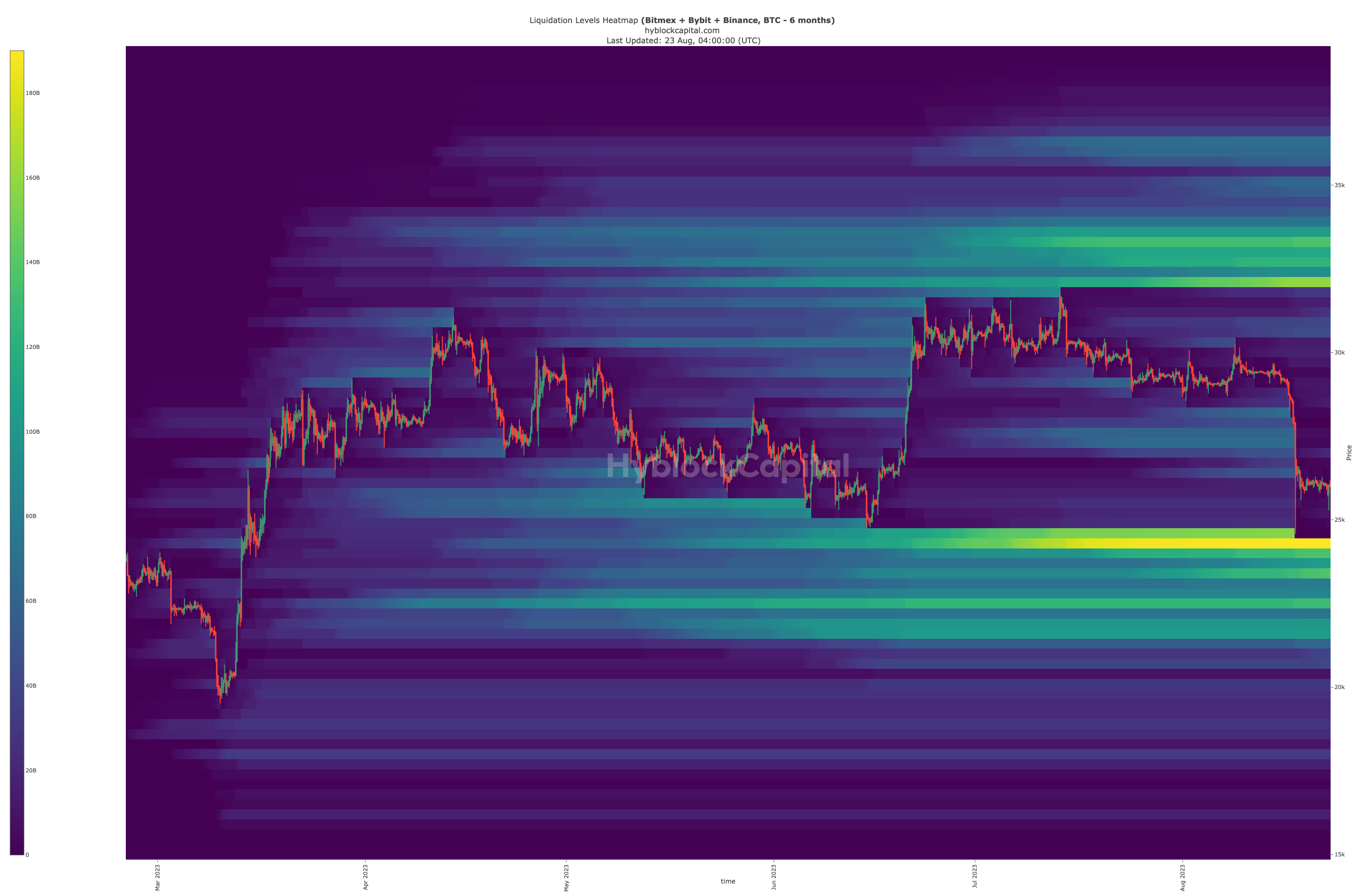 De acordo com o mapa de calor de liquidação agregada da Hyblockcapital em 23 de agosto, ordens de liquidação significativas variando de $ 22.000 a $ 25.000 ainda estão presentes. Essas ordens são acionadas quando o preço de mercado atinge ou cai abaixo do nível especificado, resultando na liquidação automática de suas posições.