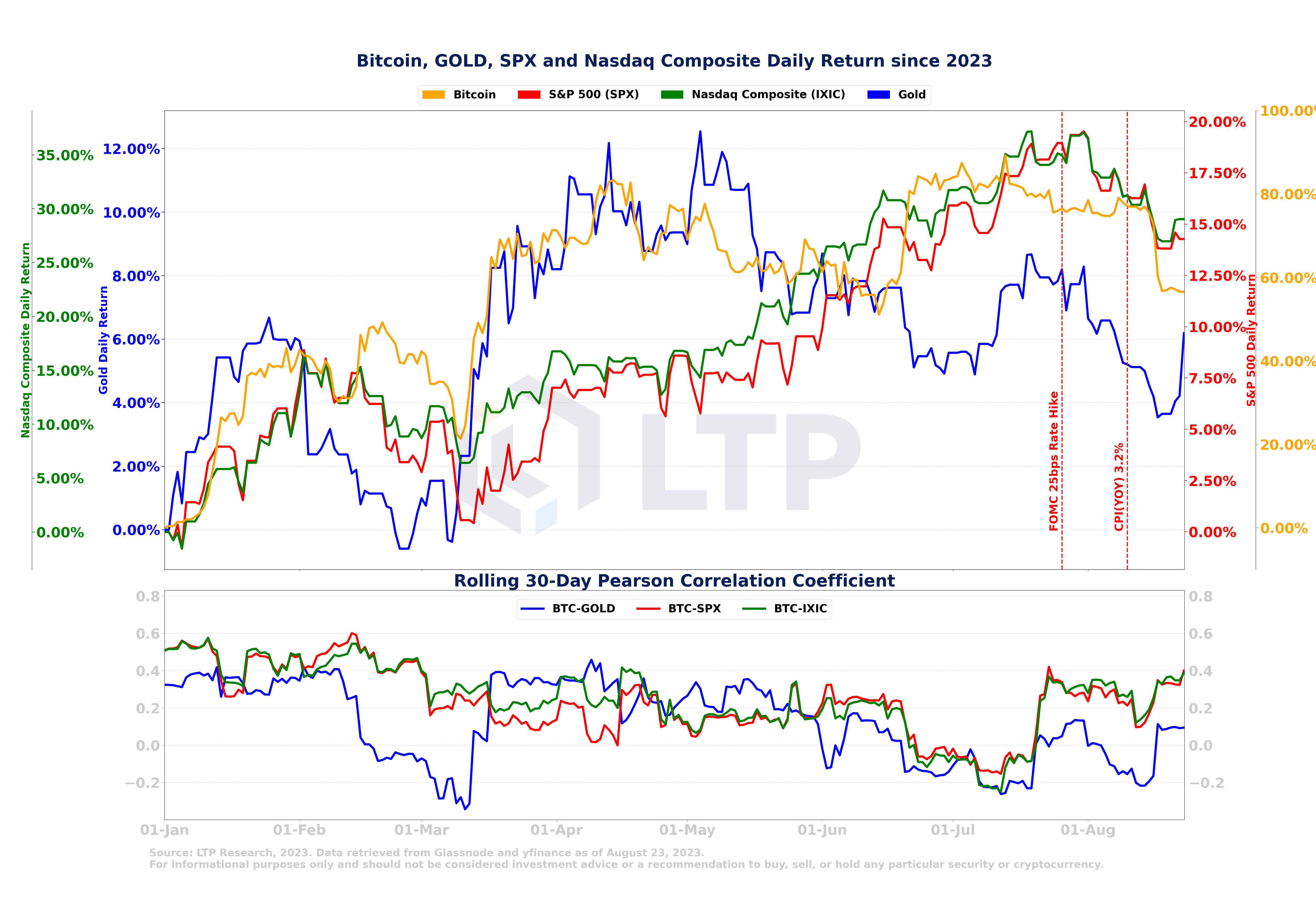 O recente declínio no valor do Bitcoin foi simultâneo a uma desaceleração mais ampla do mercado, incluindo quedas no S&P 500, Nasdaq Composite e nos preços do ouro. Esta tendência descendente começou após a última reunião do Comité Federal de Mercado Aberto (FOMC), onde o Presidente Powell sinalizou um provável prolongamento dos aumentos das taxas de juro, e foi exacerbada pelo aumento de 3,2% no Índice de Preços no Consumidor (IPC) em Julho, que marcou o primeiro aumento em 12 meses.