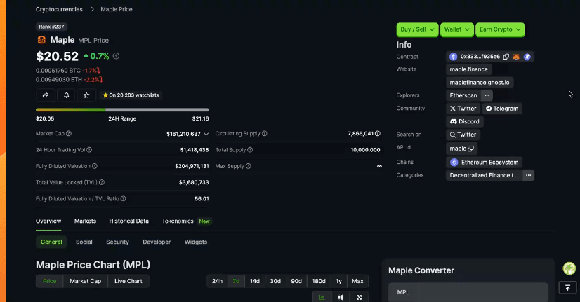Valor de mercado: $ 161 milhões Maple é um mercado de crédito corporativo descentralizado. Eles fornecem aos mutuários financiamento transparente e eficiente, tudo concluído em rede. Para provedores de liquidez, a Maple oferece uma fonte de rendimento sustentável por meio de empréstimos para pools.