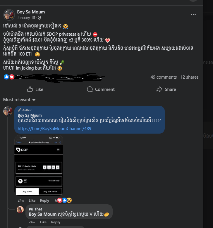 Suas ações levam a muitas pessoas feridas e perdas. O valor total perdido para $DOP Pre-sale do Camboja é estimado em cerca de $5M de investidores cambojanos. Sua ação não passará despercebida. Ele enfrentará consequências legais mais cedo do que o esperado.