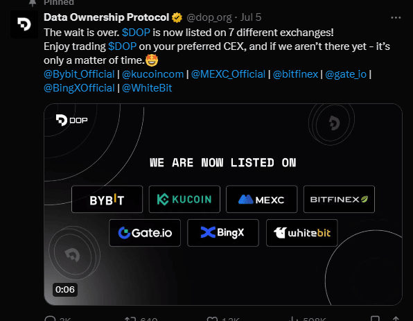 Após várias rodadas de pré-venda e uma promessa de lançar seu token no Q1, a equipe do DOP não cumpriu essa promessa. Chegando ao fim do Q2, com muita pressão de membros da comunidade e investidores de pré-venda, o DOP finalmente foi listado em várias exchanges, como Bybit, Kucoin, etc., no dia 5 de julho de 2024. O anúncio da listagem foi um parabéns dos investidores de pré-venda, mas o preço de listagem causou uma grande decepção.