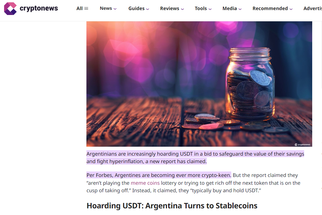 Ontem à noite li um artigo sobre como cada vez mais pessoas estão armazenando fundos em USDT, principalmente em países como a Argentina, para se protegerem da hiperinflação. Isto está acontecendo em muitos países ao redor do mundo.