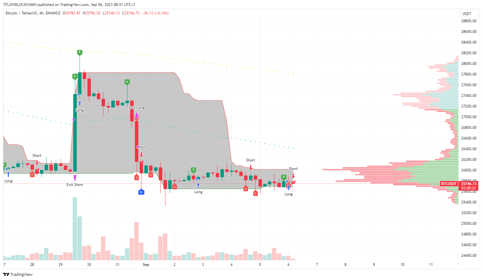 Bem-vindos a todos ao Market Monitor de hoje de 6 de setembro de 2023. Juntos, analisamos um portfólio de 10 criptomoedas e negociamos ao vivo na plataforma Binance Futures. Usamos o TFLOW Trading Engine no gráfico 4H. O valor total de mercado está em 1,04T USD, o volume diário está em 24B USD, o domínio do BTC está em 48,2% e o índice de medo e ganância está em 42.