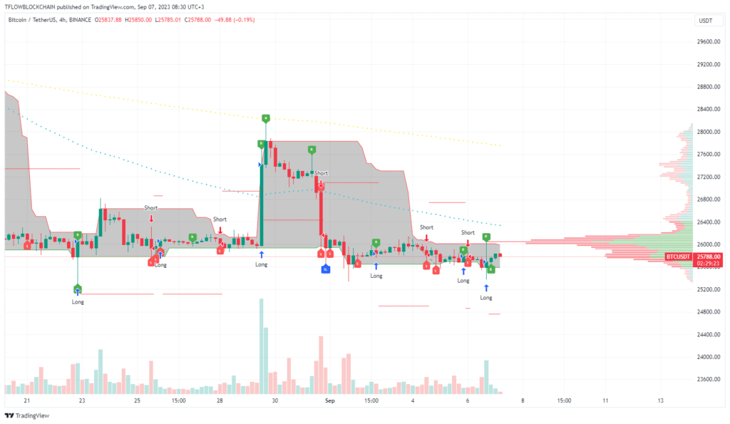 Bem-vindos a todos ao Market Monitor de hoje de 6 de setembro de 2023. Juntos, analisamos um portfólio de 10 criptomoedas e negociamos ao vivo na plataforma Binance Futures. Usamos o TFLOW Trading Engine no gráfico 4H. O valor total de mercado está em 1,04T USD, o volume diário está em 24B USD, o domínio do BTC está em 48,2% e o índice de medo e ganância está em 41.