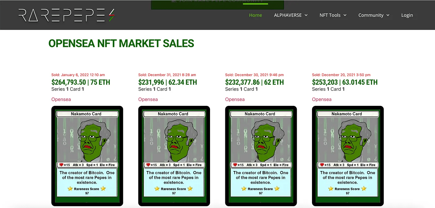 Acho que o “OG” das cartas no Web 3 World são as Rare Pepe Cards, sendo a carta Nakamoto o Graal (veja abaixo).