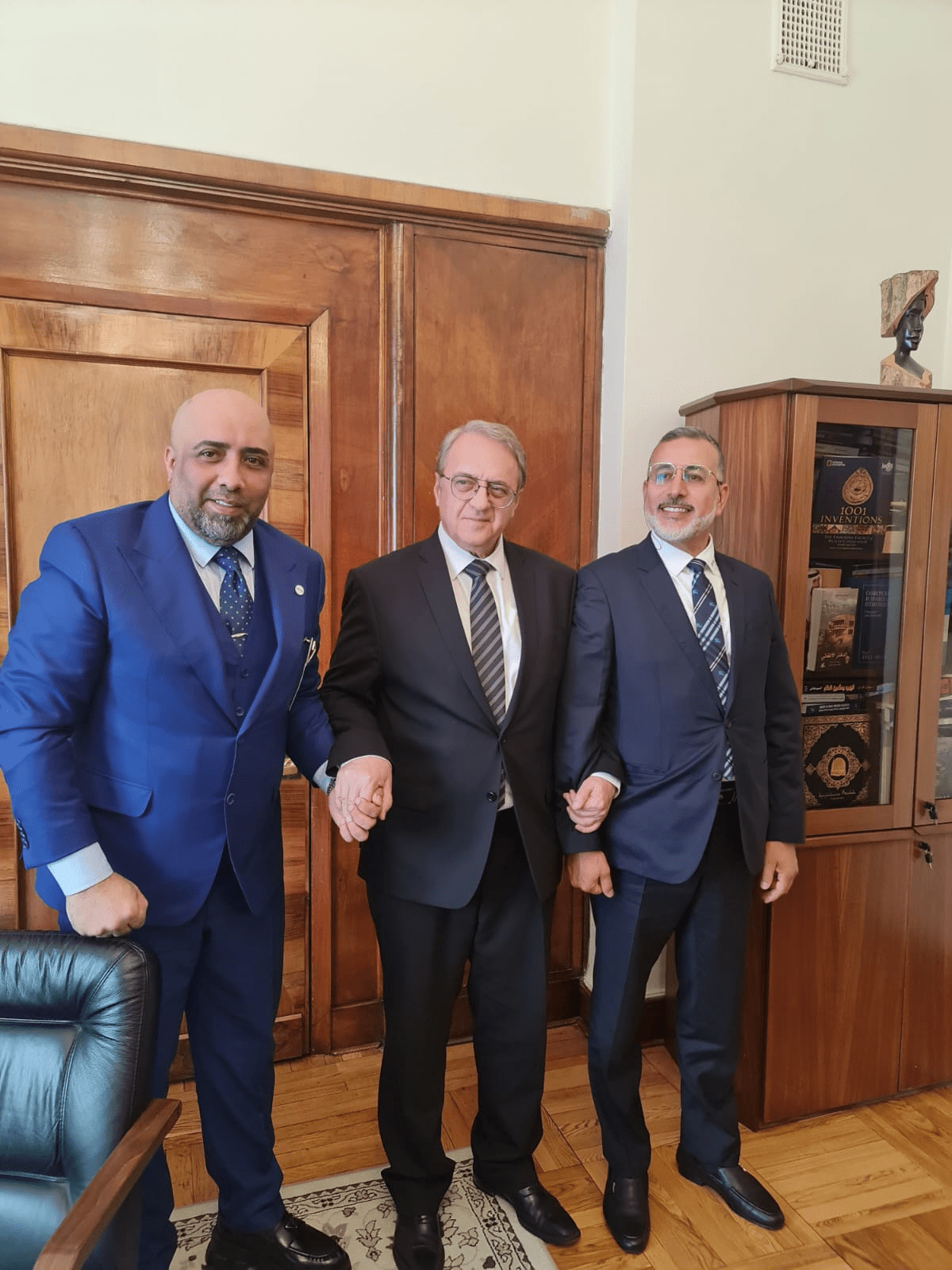 (Na foto do lado esquerdo, Dr. Hani Al-Asfar Presidente do Conselho de Administração do GCB, no meio o Ministro russo Mikhail Bogdanov, no lado direito, Membro do Conselho de Administração do GCB Sr. Ali Chiboub)