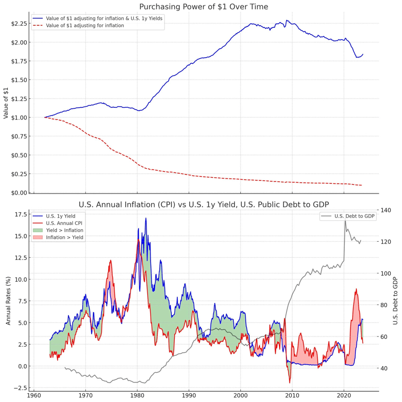 Se você conversar com a maioria dos fãs de ouro ou criptografia, inevitavelmente ouvirá a história de que o dólar americano perde valor a cada ano. Você pode ver isso com a linha pontilhada vermelha abaixo. A razão para isto parece ser que há sempre algum tipo de impressão de dinheiro, também conhecida como inflação, que degrada a moeda. Mas isto é apenas parcialmente verdade porque não tem em conta as taxas de juro que as pessoas recebem pelos seus dólares quando os poupam.