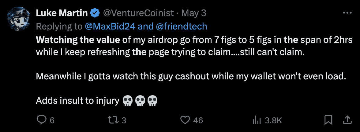 As coisas mudaram em maio de 2024 quando a friend.tech distribuiu seu airdrop para os usuários. Uma baleia conhecida como “Murphys1d” vendeu rapidamente todos os tokens recebidos poucas horas após o início do airdrop. Essa venda repentina e significativa levantou preocupações sobre a justiça do airdrop e a potencial manipulação do preço do token.
