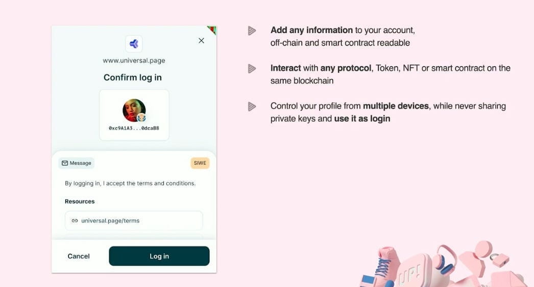 Os Perfis Universais são acessíveis de vários dispositivos e oferecem controle granular sobre o acesso aos dados, fornecendo vários níveis de permissões para diferentes atividades, como atualização de perfis, transferência de ativos, interação com contratos inteligentes e assinatura em dApps. Além disso, os UPs oferecem suporte a mecanismos de recuperação de senha e recuperação social, aumentando a segurança e a conveniência do usuário. Eles também facilitam transações sem gás, com terceiros cobrindo as taxas, e podem armazenar informações de identidade abrangentes, agindo como um perfil de identidade completo.