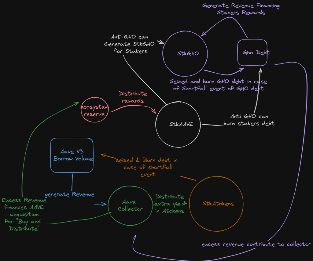 O $AAVE apostado rende “Anti-GHO”, que pode ser usado para pagar dívidas do GHO ou depositado diretamente no módulo de piquetagem do GHO, permitindo assim que os apostadores do $AAVE também se beneficiem dos lucros gerados pelo GHO.