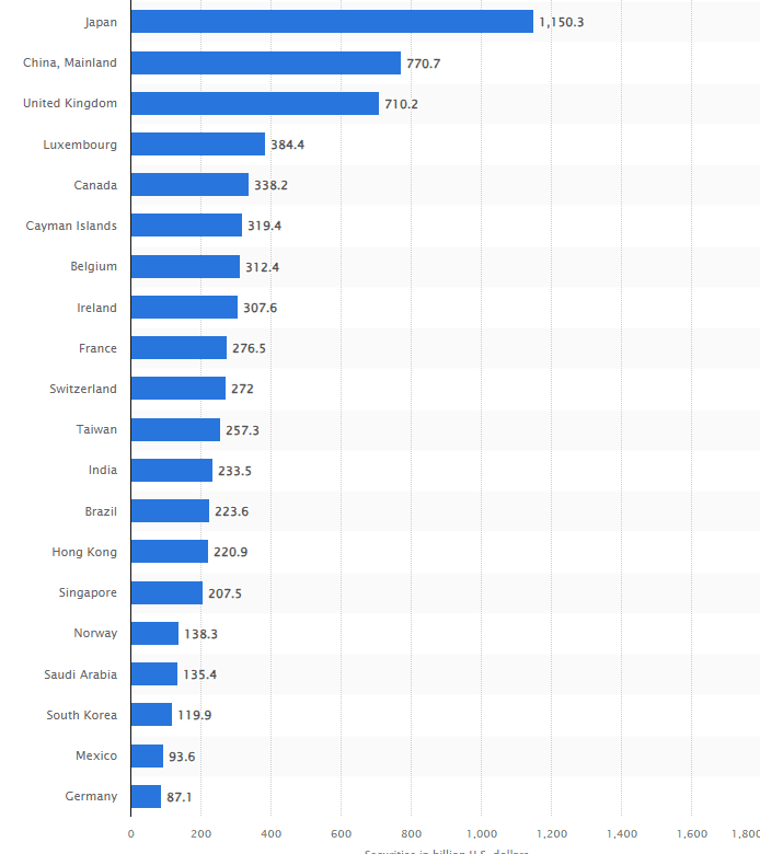 Esta é uma lista (em bilhões de dólares americanos) dos maiores detentores estrangeiros de títulos do Tesouro dos EUA👇