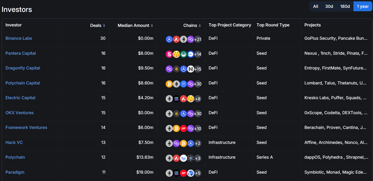 A imagem abaixo mostra os líderes em negócios de capital de risco em criptomoedas no último ano.👇 (Você pode encontrar esta lista no DefiLlama)