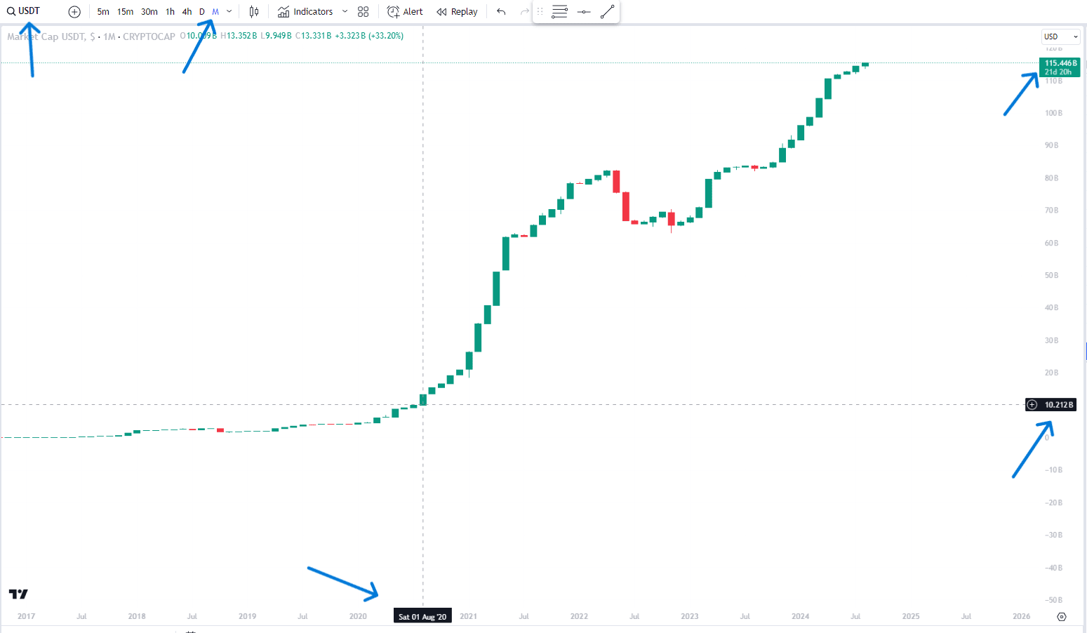 Este é o aumento do valor de mercado do USDT nos últimos 4 anos 👇(velas mensais)