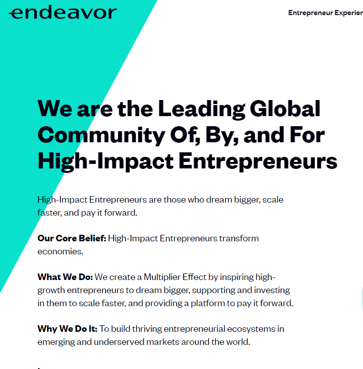 Para uma empresa em dificuldades na América Latina, África, Ásia ou Oriente Médio, uma tábua de salvação da Endeavor e acesso à sua rede global é um caminho certo para o sucesso, se eles selecionarem você, mas lembre-se de que você tem que retribuir.