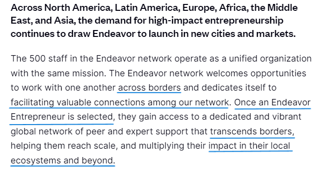 Endeavor é uma rede de "filantropia" administrada pelos Estados Unidos que se estende pelo mundo. Por meio de suas finanças e poder, ela criou uma rede e um ecossistema globais ao capacitar pessoas e empresas selecionadas para fazer parte do ecossistema de empreendimentos. A maior parte desse foco está no Sul global.