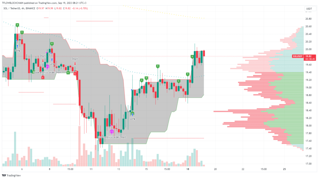 Bem-vindos a todos ao Market Monitor de hoje de 19 de setembro de 2023. Juntos, gerenciamos um portfólio de 10 criptomoedas e negociamos ao vivo na plataforma Binance Futures. Usamos o TFLOW Trading Engine no gráfico 4H. O valor total de mercado está em 1,07T USD, o volume diário está em 29B USD, o domínio do BTC está em 49,1% e o índice de medo e ganância está em 46.