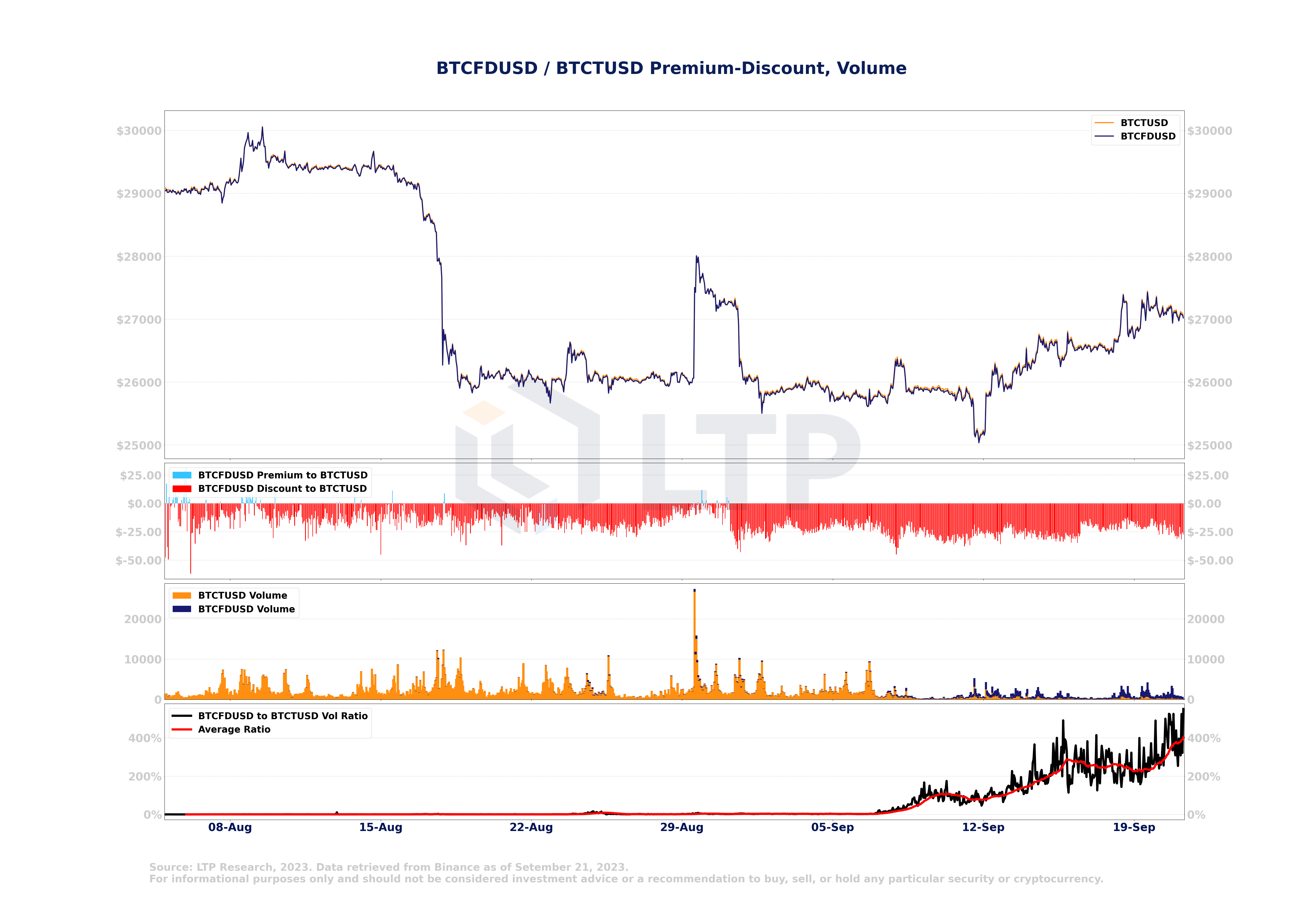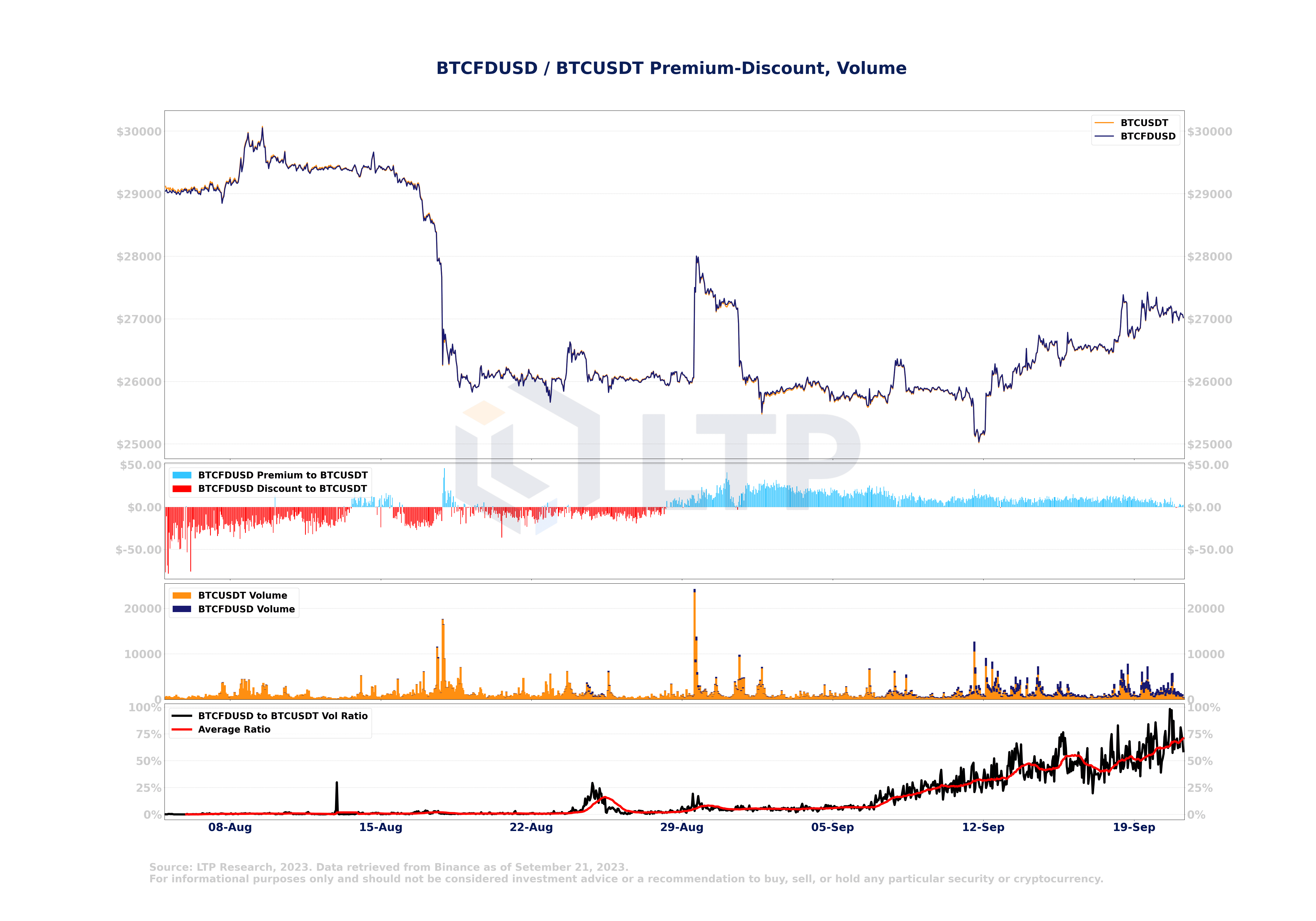 À medida que o volume de negociação começou a aumentar em 5 de setembro e a atividade mudou de BTCTUSD para BTCFDUSD, o BTCFDUSD começou a ser negociado com um prêmio sobre o BTCUSDT.