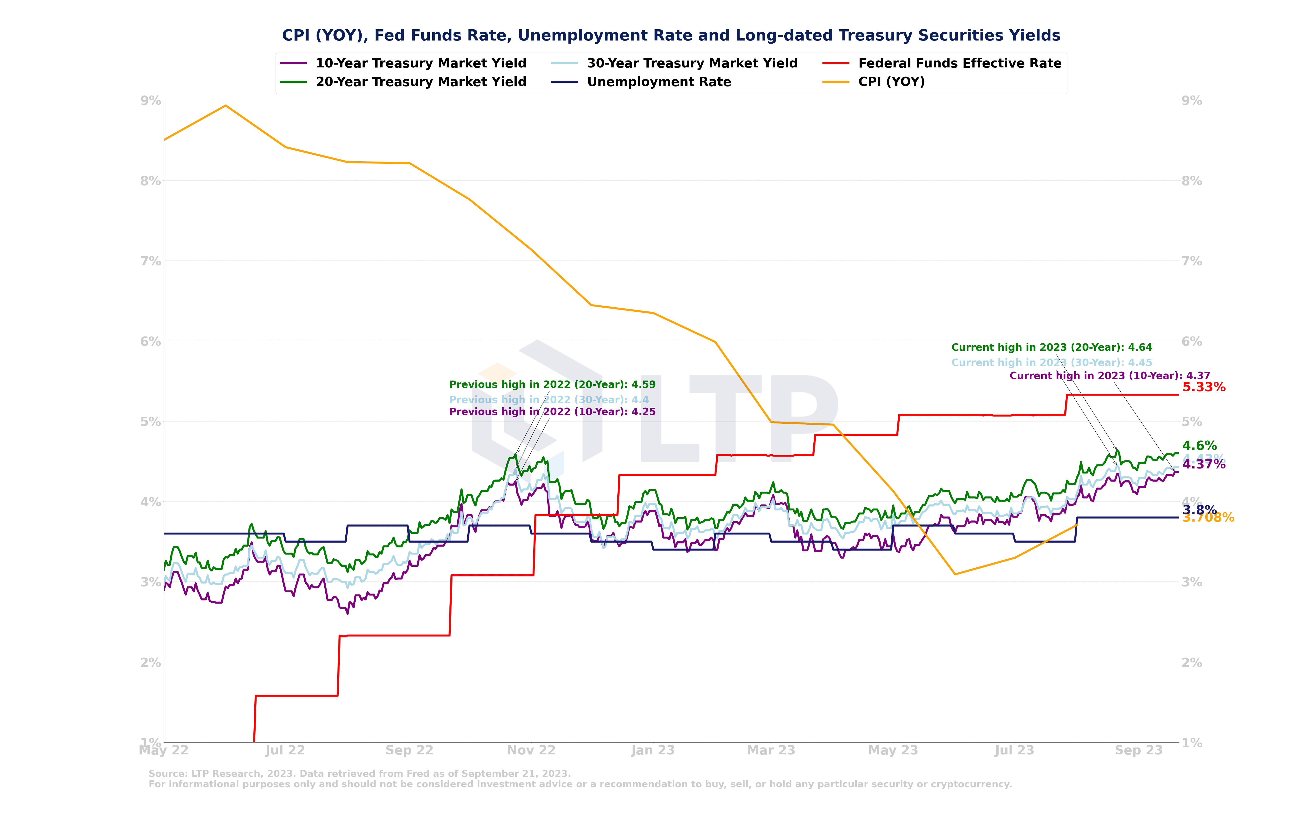 Em 20 de setembro, o Reserva Federal anunciou que manteria as taxas de juros em uma faixa-alvo de 5,25% a 5,5%, em linha com as expectativas do mercado. Durante sua conferência de imprensa pós-reunião, o presidente do Fed, Jerome Powell, enfatizou que o comitê está monitorando de perto os dados econômicos atuais para determinar se eles alcançaram a postura de política monetária desejada. Powell também observou que a inflação, excluindo os preços dos alimentos voláteis e da energia, está caindo. No entanto, o aumento dos custos de energia continua uma preocupação, particularmente dado o recente aumento nos preços da gasolina para máximos de 2023.