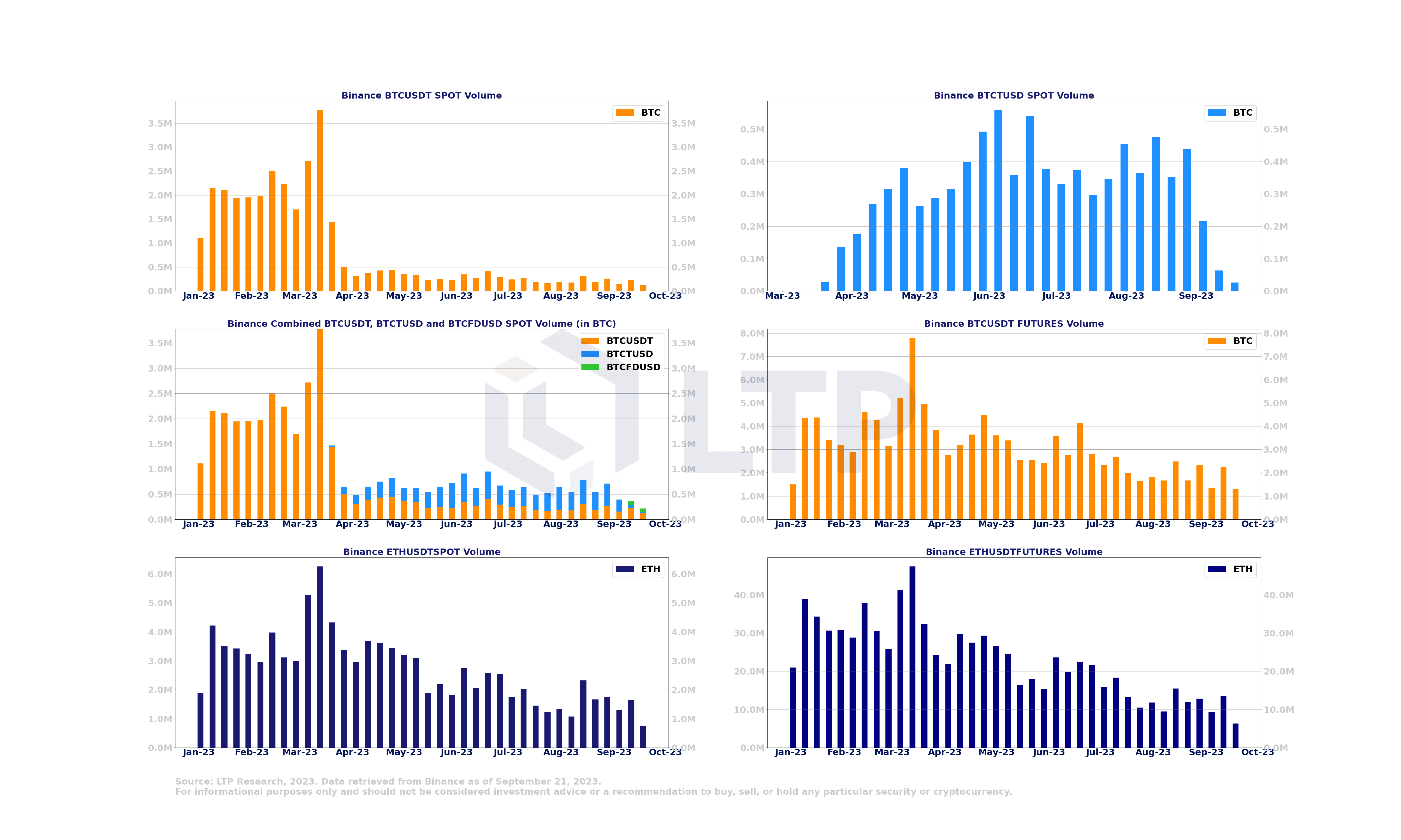 As primeiras duas semanas de setembro viram um declínio no volume de negociação para os mercados de Bitcoin Spot e Futuros Perpétuos na Binance. Notavelmente, o mercado de Bitcoin Spot experimentou uma baixa anual no volume de negociação, com um total combinado de aproximadamente 400 mil BTC por semana para BTCUSDT, BTCTUSD e BTCFDUSD.