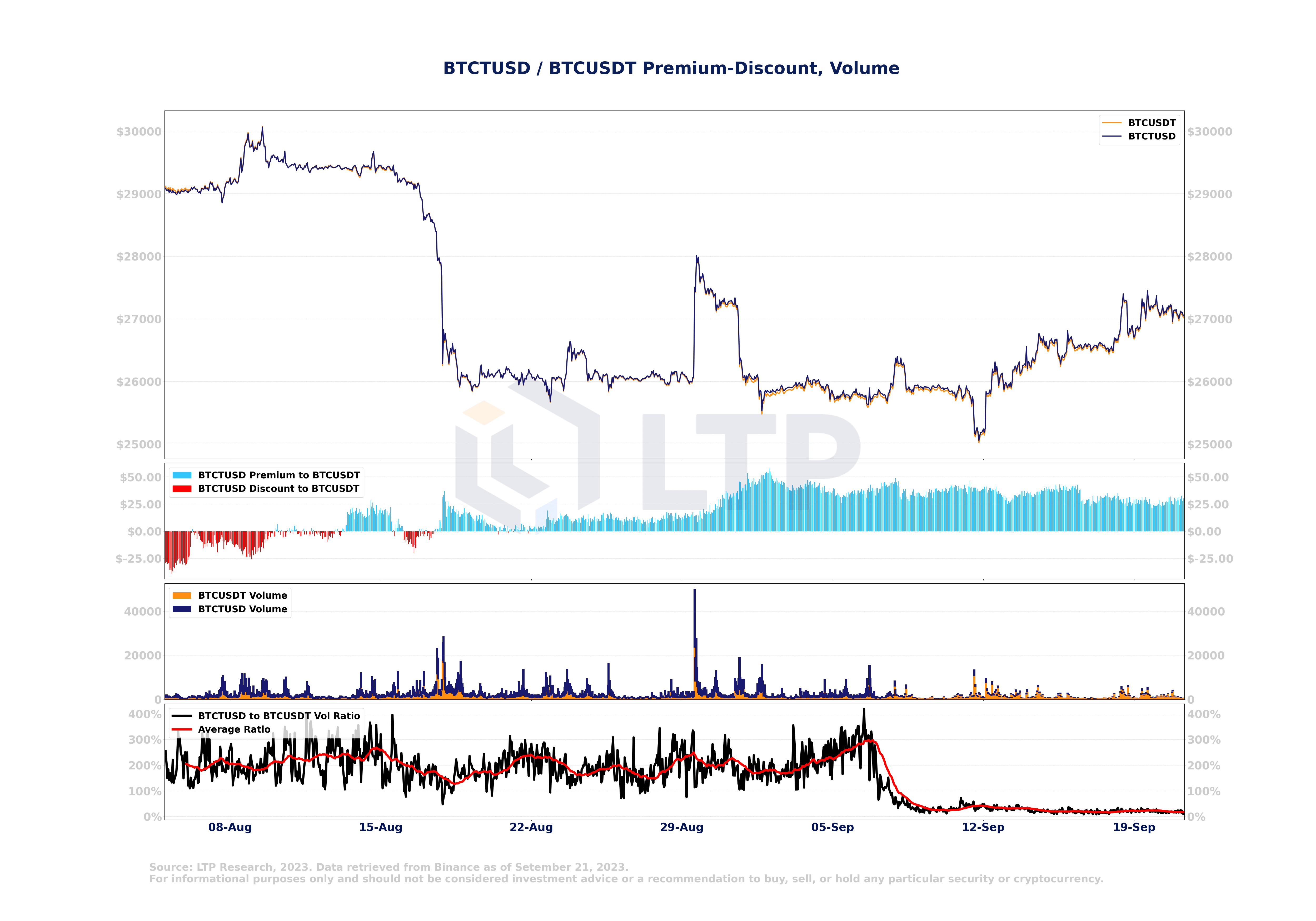 O volume de negociação do BTCTUSD sofreu um declínio significativo a partir de 5 de setembro, mas é digno de nota que ele continua sendo negociado com um prêmio sobre o BTCUSDT, apesar dessa redução no volume.