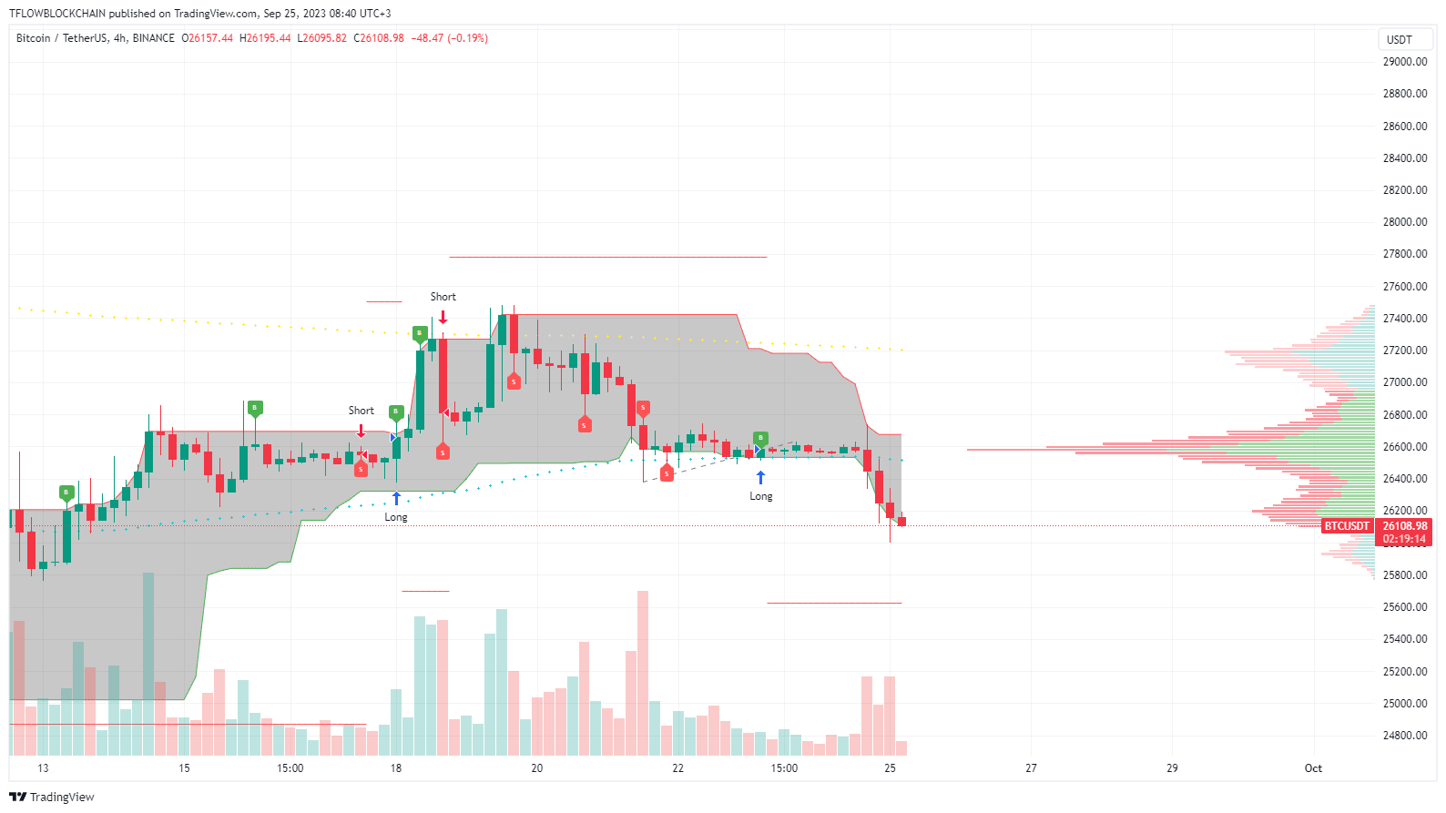 Bem-vindos a todos ao Market Monitor de hoje de 25 de setembro de 2023. Juntos, gerenciamos um portfólio de 10 criptomoedas e negociamos ao vivo na plataforma Binance Futures. Usamos o TFLOW Trading Engine no gráfico 4H. O valor total de mercado está em 1,06T USD, o volume diário está em 27B USD, o domínio do BTC está em 49,2% e o índice de medo e ganância está em 47.