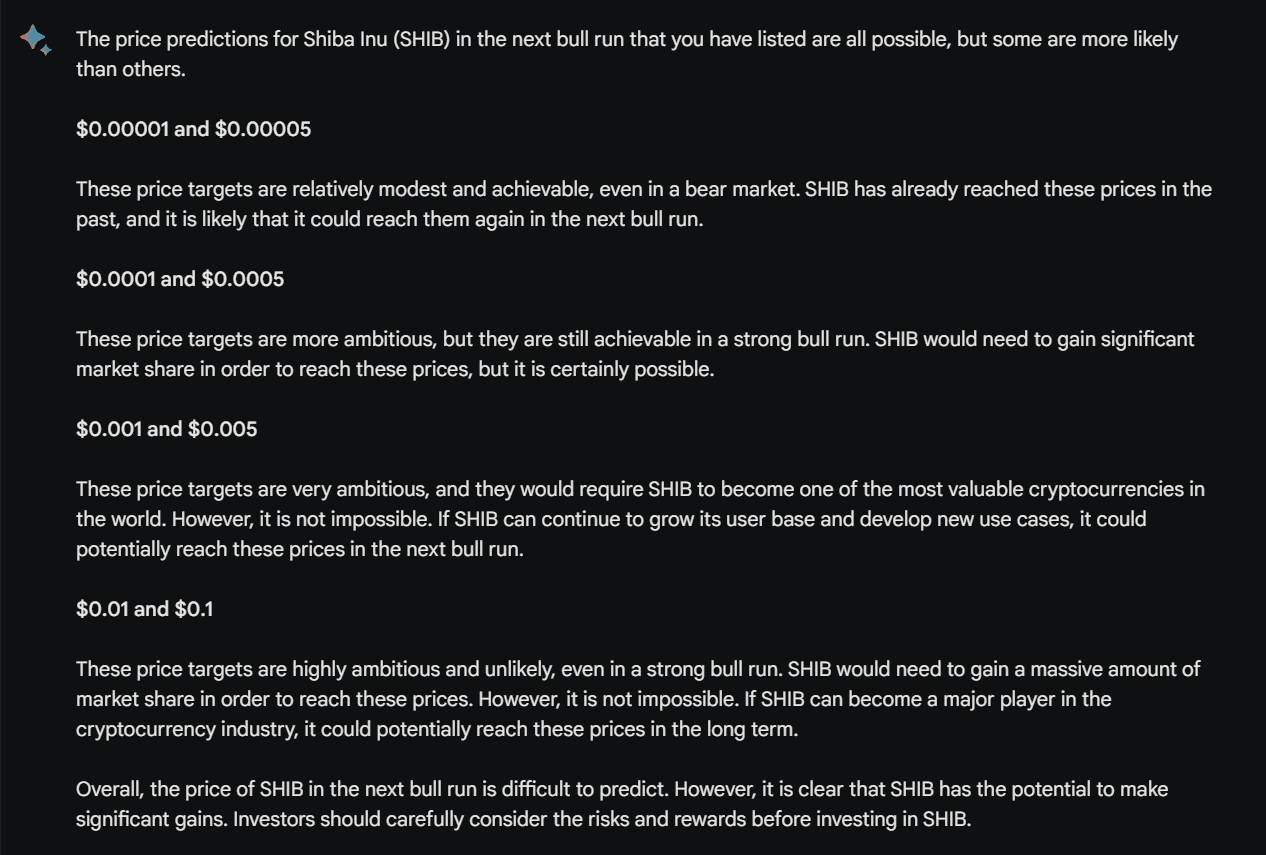 De acordo com a IA experimental do Google, as previsões de preços para Shiba Inu na próxima corrida de touros variam amplamente:
