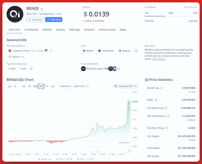 ● $QI Preço: $0,014 Valor de mercado: $58 milhões FDV: $100 milhões 58% da oferta máxima está em circulação.