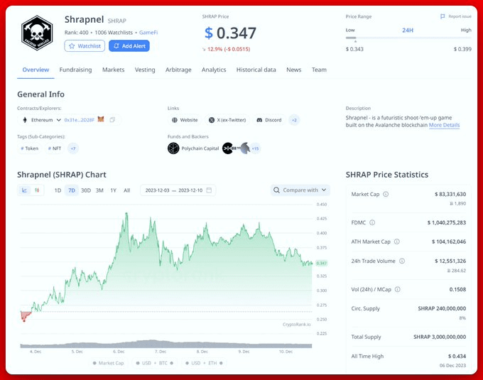 ● $SHRAP Preço: $0,34 Valor de mercado: $83 milhões FDV: $1B 8% da oferta máxima está em circulação.