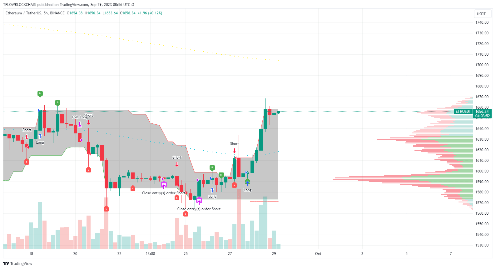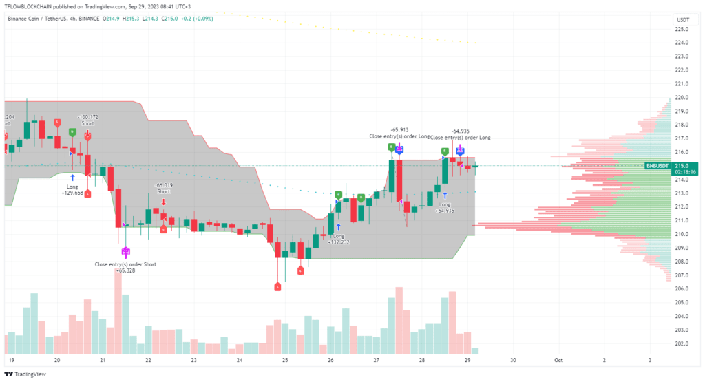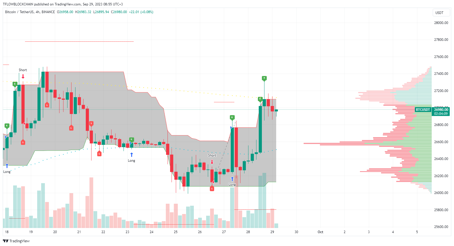 Bem-vindos a todos ao Market Monitor de hoje de 29 de setembro de 2023. Juntos, gerenciamos um portfólio de 10 criptomoedas e negociamos ao vivo na plataforma Binance Futures. Usamos o TFLOW Trading Engine no gráfico 4H. O valor total de mercado está em 1,05 trilhão de dólares, o volume diário está em 28,9 bilhões de dólares, o domínio do BTC está em 49% e o índice de medo e ganância está em 48.