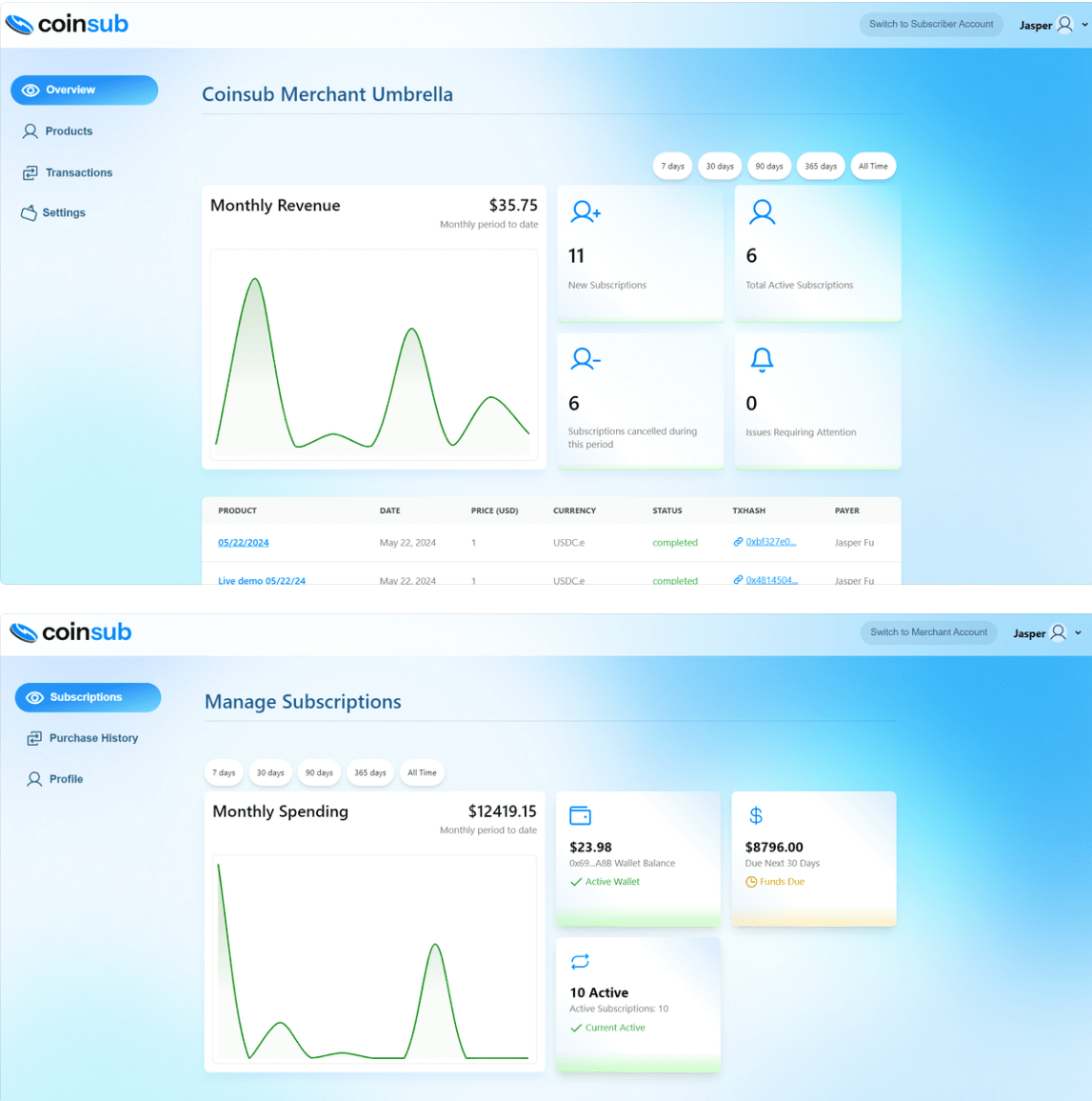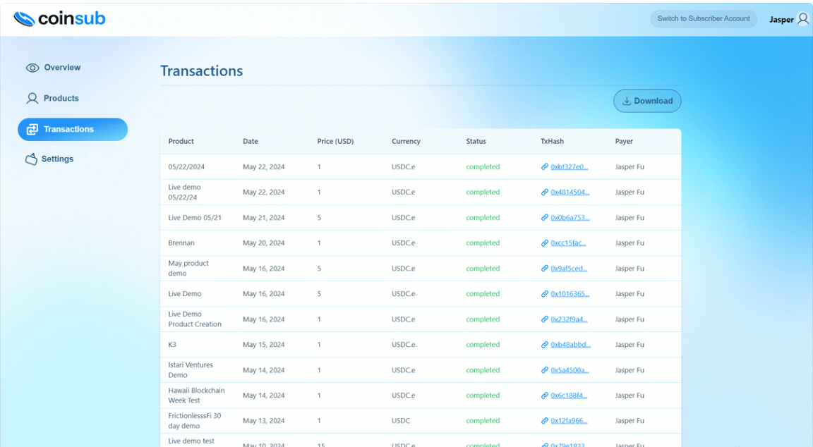 A plataforma da Coinsub também oferece controle completo sobre transações únicas e recorrentes. O painel de controle amigável permite que as empresas rastreiem pagamentos, gerenciem assinaturas de clientes e visualizem históricos de transações em tempo real. O backend lida com todas as complexidades, para que os usuários não precisem se preocupar com coisas como trocas de tokens ou taxas de rede.