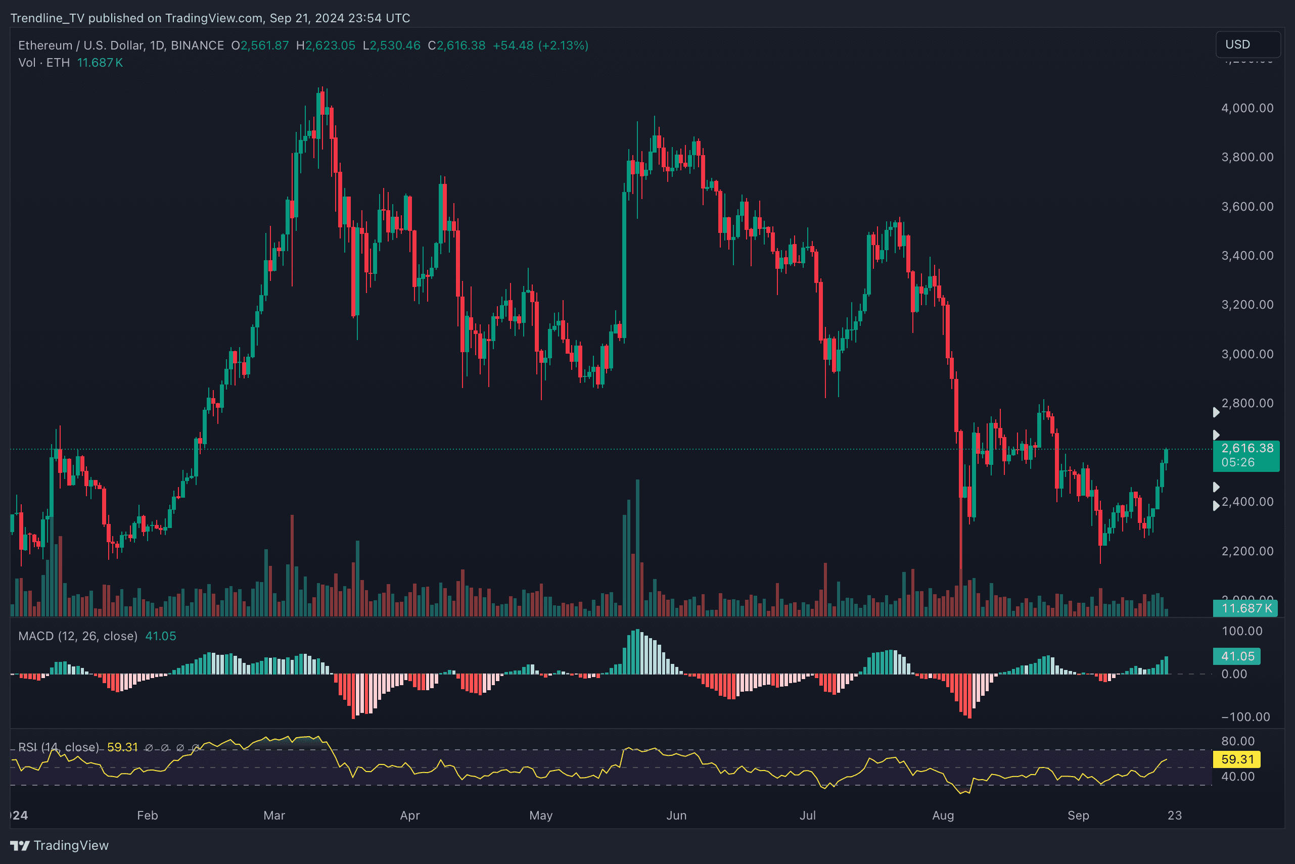 - O Ethereum está em tendência de alta, seguindo um recente rali do suporte de US$ 2.200,00. Nenhum padrão claro de cabeça e ombros ou cunha observado, mas a ação do preço sugere continuação de alta adicional se os níveis de resistência forem quebrados.