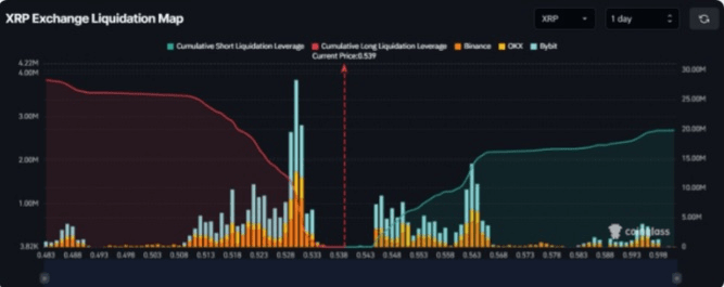 Além da análise técnica, as métricas on-chain do XRP também dão suporte a essa perspectiva otimista. De acordo com a empresa de análise on-chain Coinglass, os principais níveis de liquidação estão em US$ 0,53 e US$ 0,563, pois os traders estão superalavancados nesses níveis.