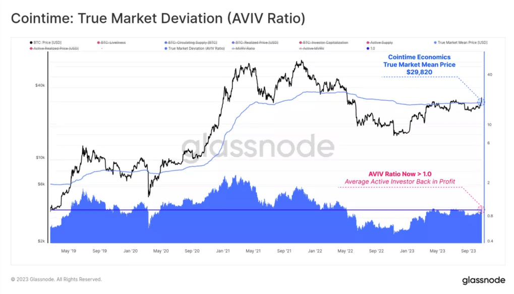 A análise técnica do ouro digital é mostrada abaixo. O gráfico a seguir ilustra a dinâmica de preços do Bitcoin, juntamente com o indicador True Market Mean Price desenvolvido em colaboração com ARK Invest (US$ 29.820).