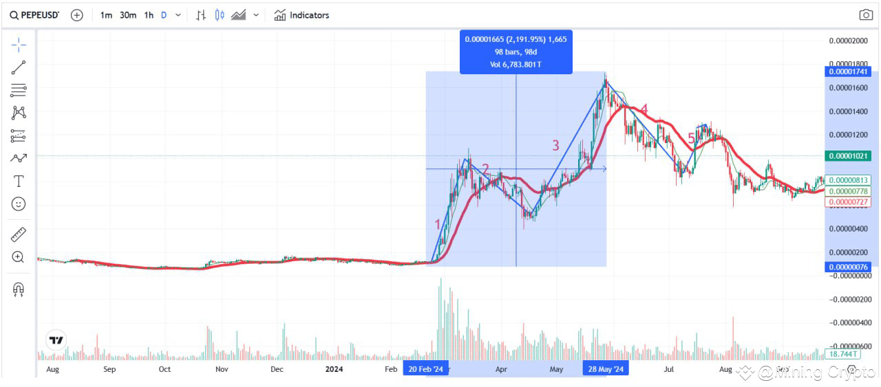 Se tivesses colocado 100$ em PEPE no dia 20 de fevereiro de 2024, apenas 98 dias depois, no dia 28 de maio de 2024, terias transformado esse valor em 2.191$. Isso representa uma valorização impressionante de 2.191%. 💥