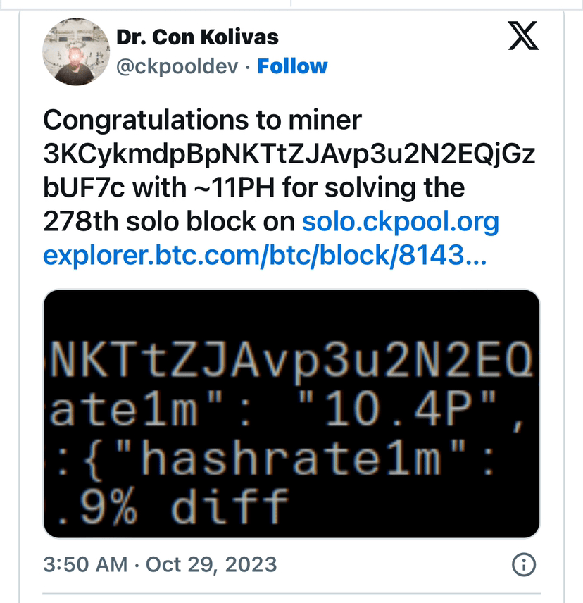 On October 29, a solo miner with a hardware hashrate of 11 PH/s added block #814,308 to the blockchain of the first cryptocurrency. This was reported by CKPool administrator Con Kolivas.