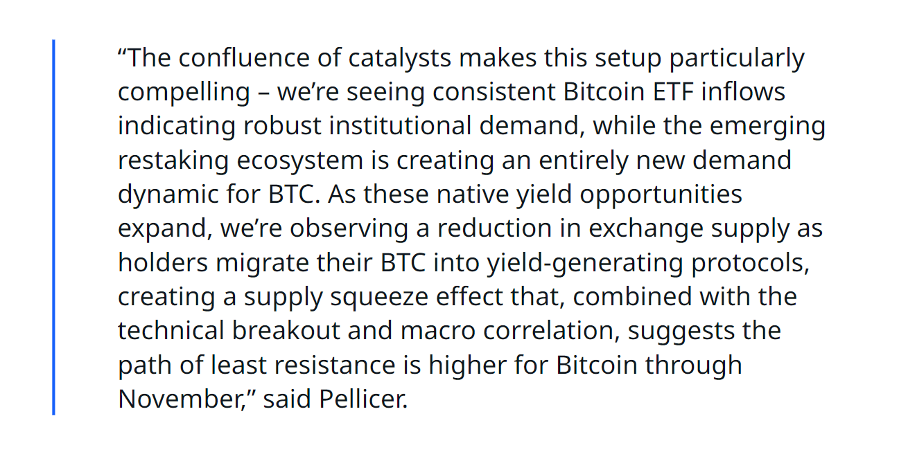 Tudo se resume à demanda gerada pelos ETFs de Bitcoin e ao surgimento de protocolos de geração de rendimento, que juntos criaram uma enorme “contração de oferta”.
