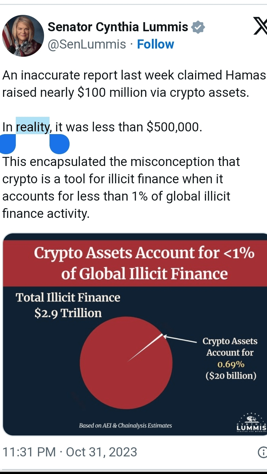 “Relatórios meticulosos da Chainalysis descobriram que os ativos criptográficos representam apenas US$ 20 bilhões, menos de 1% dos mais de US$ 2 trilhões em atividades financeiras ilícitas globais a cada ano”, escreveu Lummis. Na última quinta-feira, Lummis assinou uma carta ao procurador-geral dos EUA, Merrick Garland, pedindo acusações contra a Binance, uma grande bolsa de criptomoedas offshore na qual mais de 100 contas foram associadas a terroristas do Hamas desde 2021.