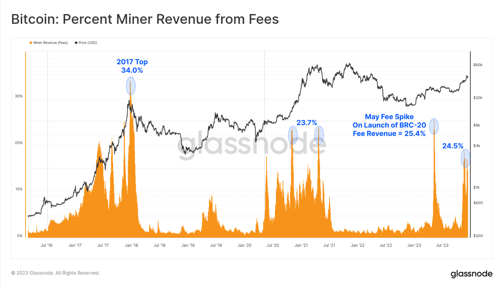 Como esperado, o aumento na demanda pela rede BTC levou a um aumento nas receitas das mineradoras. De acordo com a Glassnode: Como resultado deste novo comprador de espaço de bloco Bitcoin, a receita dos mineradores provenientes de taxas aumentou significativamente, com vários blocos em 2023 pagando taxas que até excederam o subsídio de 6,25 BTC.