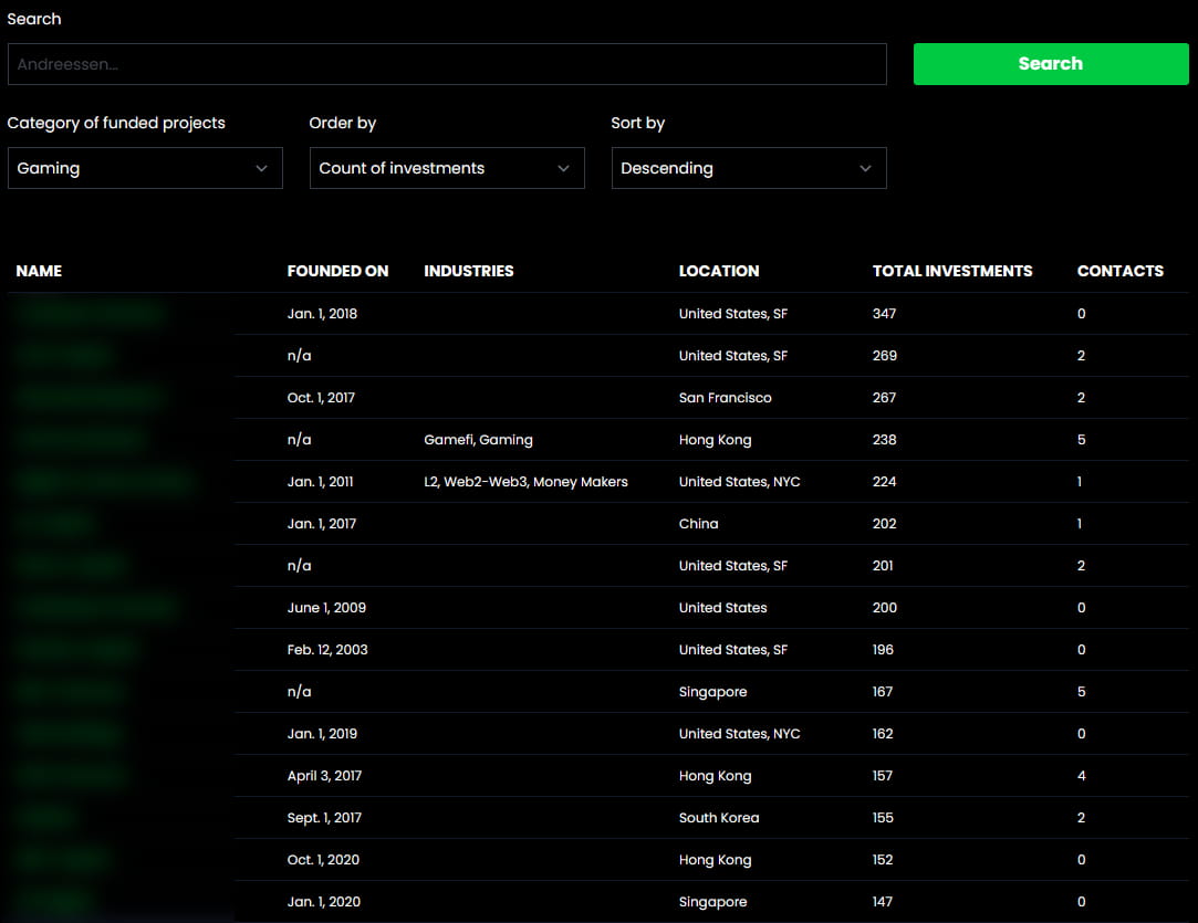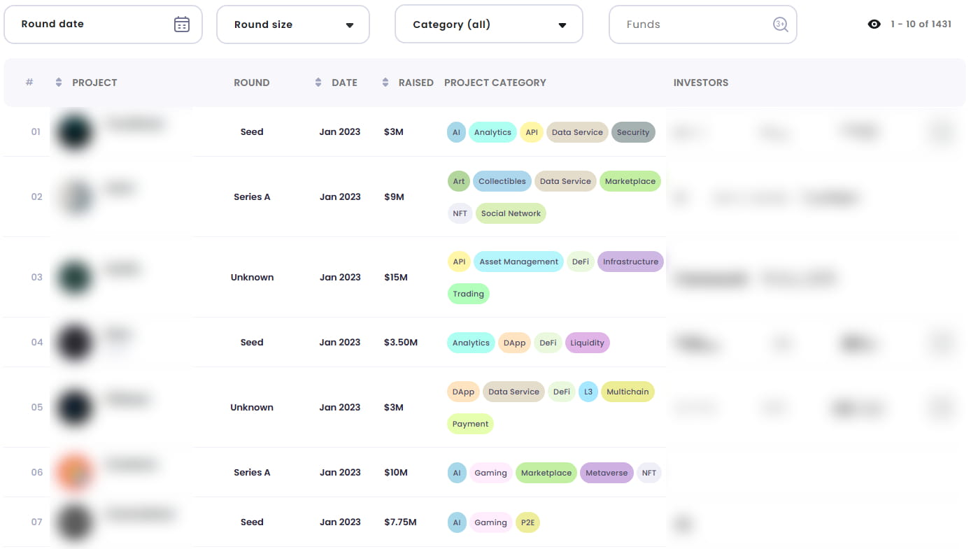 Com a capacidade de navegar em um banco de dados de investidores conhecidos nos ecossistemas Web3 e filtrar por segmento de mercado, ordenar por vários detalhes e classificar por diferentes critérios, você pode encontrar rapidamente uma coleção de potenciais investidores que correspondam ao escopo de nível superior do que você estão construindo.