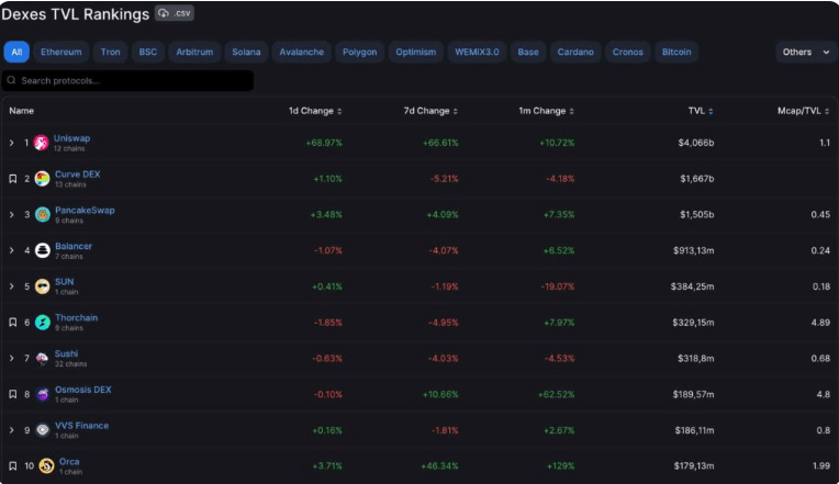 O Uniswap talvez esteja liderando as exchanges descentralizadas. É falado em todos os círculos criptográficos como um dos protocolos mais robustos nesta categoria. Surgiu inicialmente no Ethereum (ETH), mas depois se expandiu e agora suporta 12 redes com um TVL de US$ 4,06 bilhões.