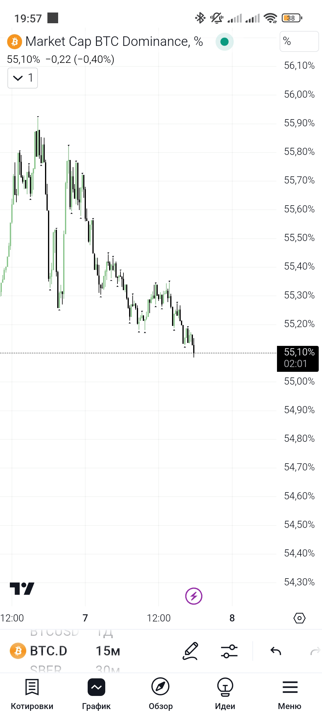 O domínio do BTC no mercado de criptomoedas permanece acima de 55%, indicando sua primazia entre outros ativos digitais. O impacto das altcoins (como Ethereum) é insignificante, o que pode indicar o foco dos investidores em ativos seguros em uma situação macroeconômica instável.