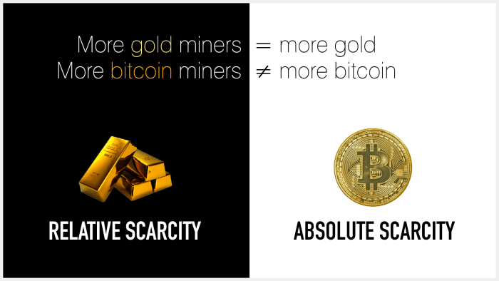 Ambas as mercadorias são escassas, mas ninguém conhece a oferta global de ouro, embora saibamos que haverá apenas cerca de 21 milhões de bitcoins em circulação. O ouro tem escassez relativa, o que significa que é escasso em relação à quantidade de energia aplicada para extraí-lo. O Bitcoin é absolutamente escasso, o que significa que é finito. Não importa quanta energia seja gasta na mineração, a rede continuará a produzir novos blocos na mesma taxa e com limite máximo.